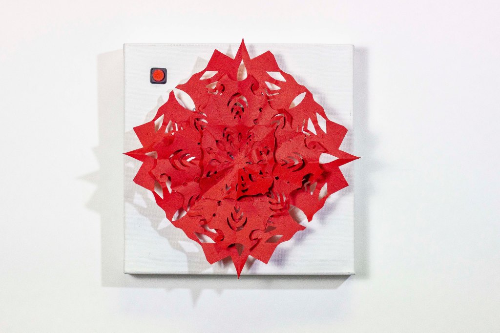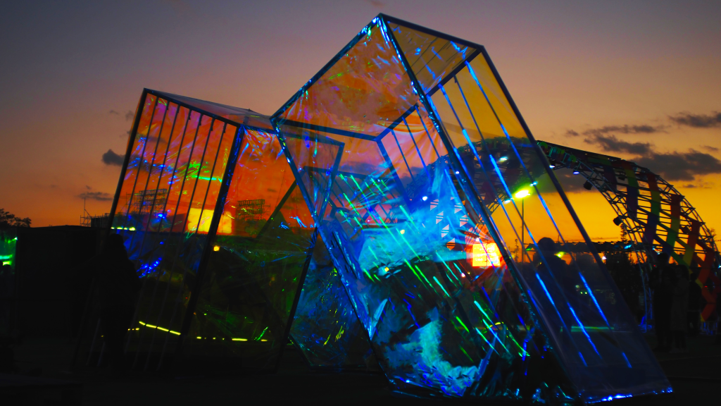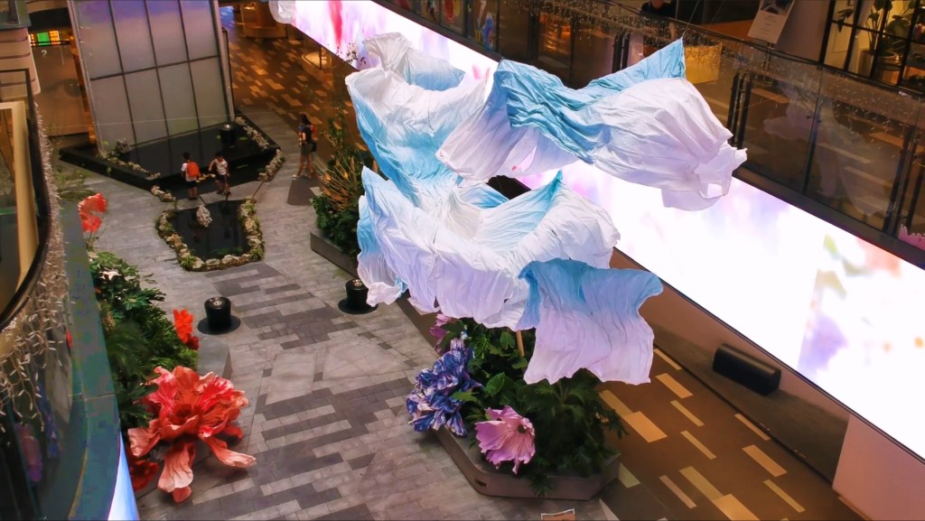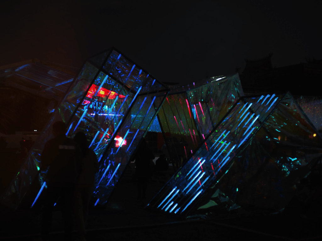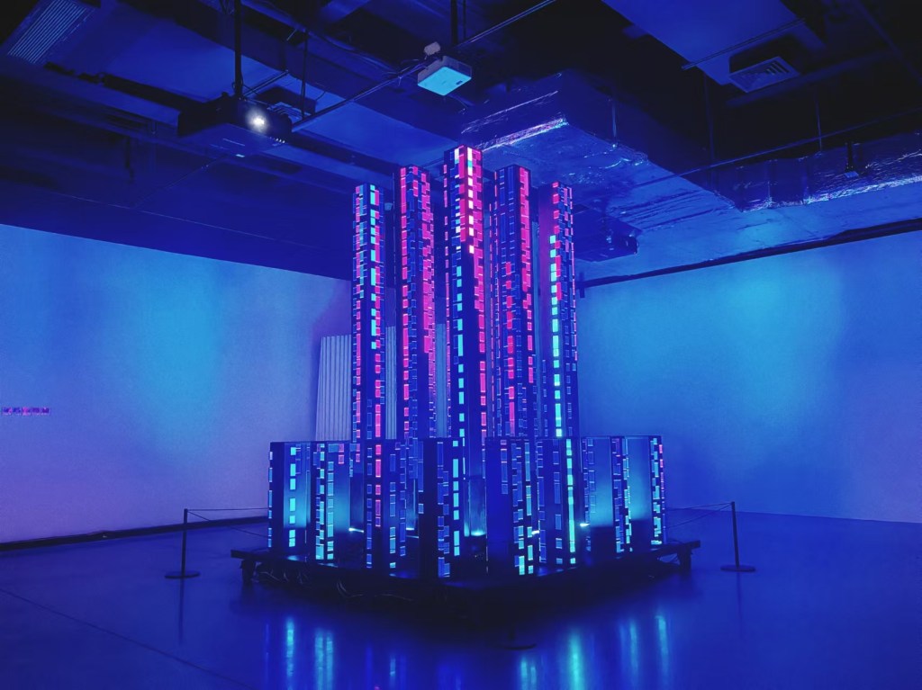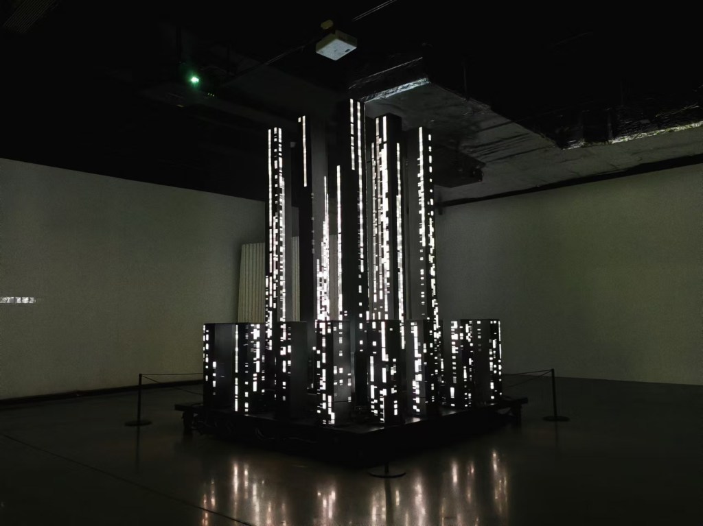 “Memory of the Tides” utilizes computer simulation to dynamically model ocean waves, extracting vertex data generated in the process. This data, infused with the artist’s graphic interpretation of tidal forms, is projected onto fabrics that flutter with the wind. The installation as a whole creates a scene of surging tides, employing simulated dynamics of reality to represent unreal phenomena.